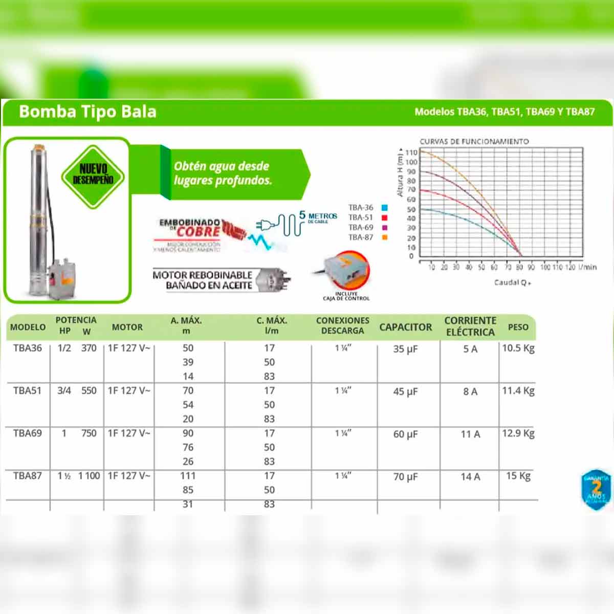 Embobinado de cobre, balero 100% metálico.